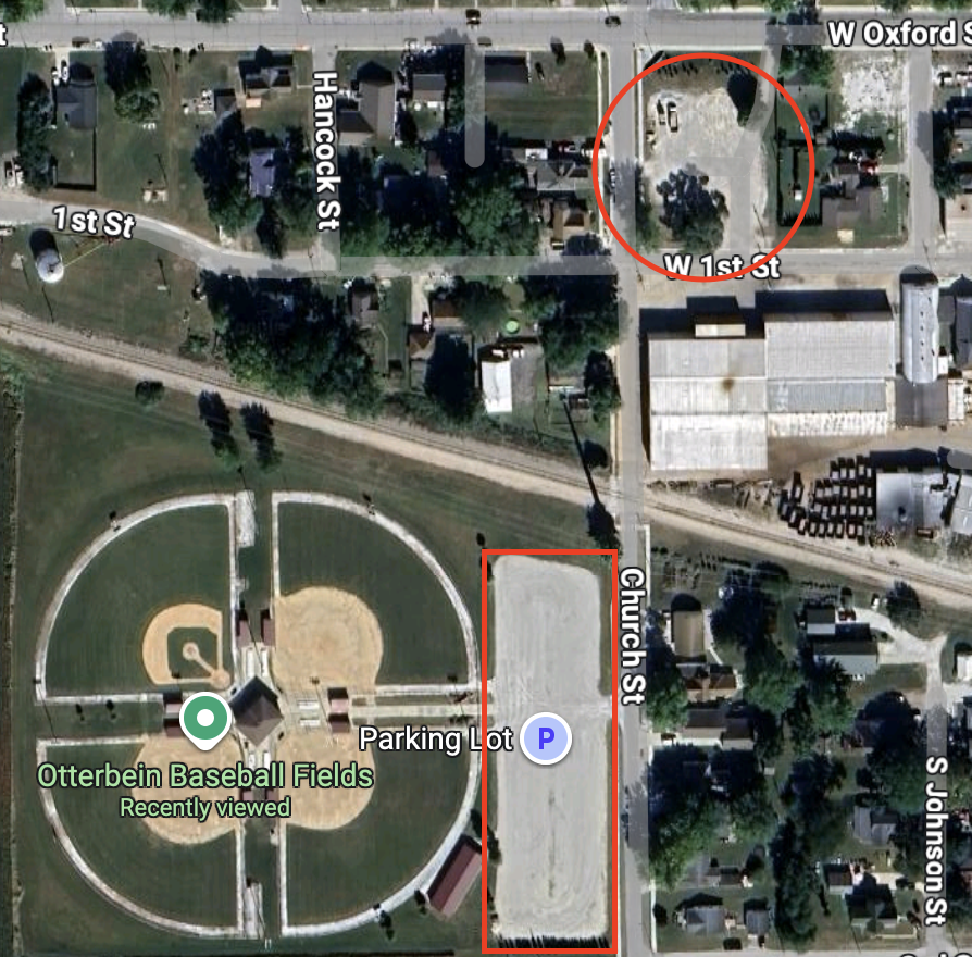 Otterbein Baseball Fields has gravel parking on site. This parking is limited. Additional parking is available on the grass hill on the North end of the parking lot and one block away on the corner of 1st and Church Street (gravel lot identified as parking for Rowe Trucking).